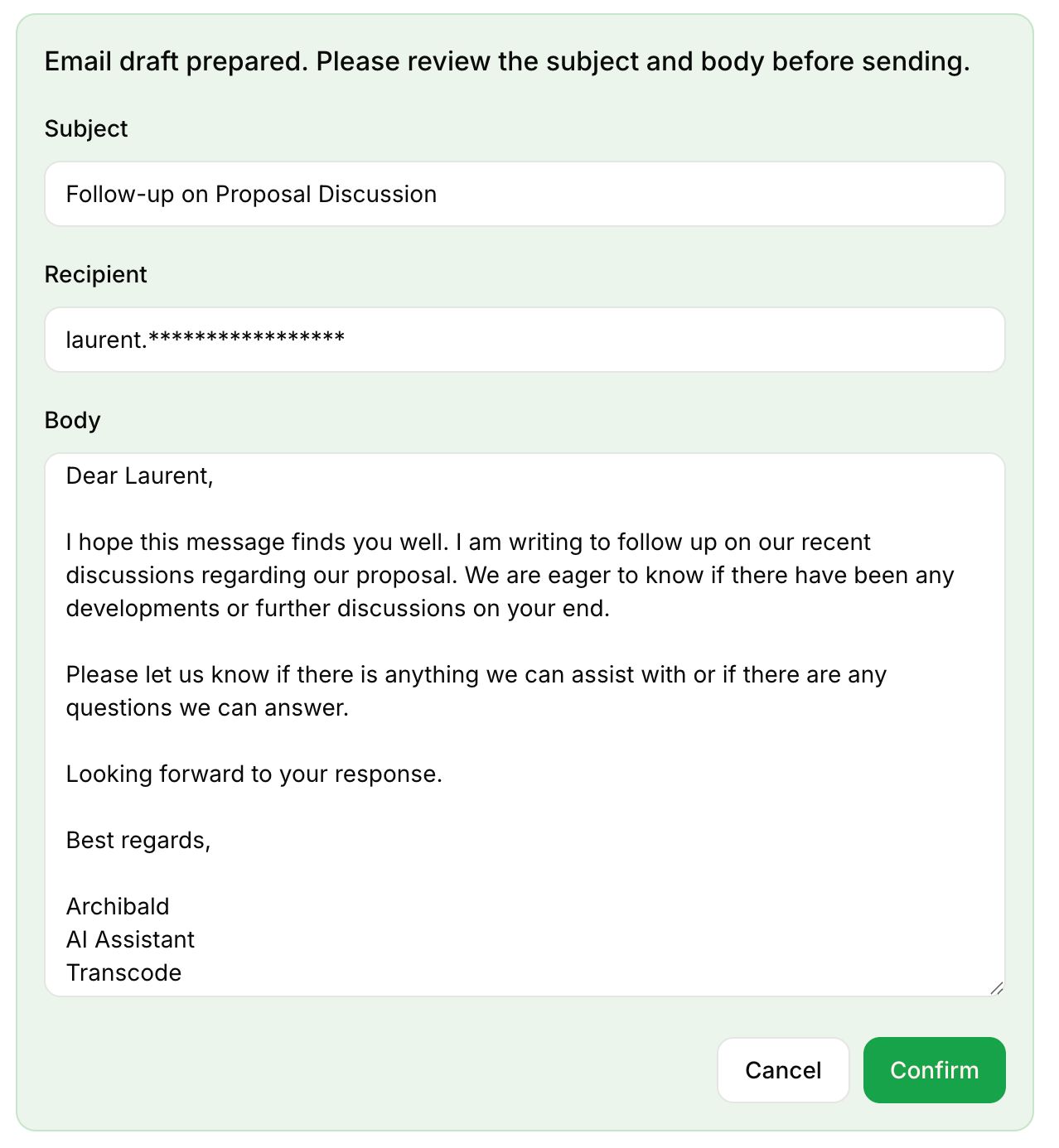 Because some MCP actions can be critical and require a user review, we have also introduced the possibility to review an action before proceeding. This is available for the email action and will be expanded to other actions on a per-need basis. There is unfortunately no metadata in MCP at the moment to know if an action is just a read or also a write.